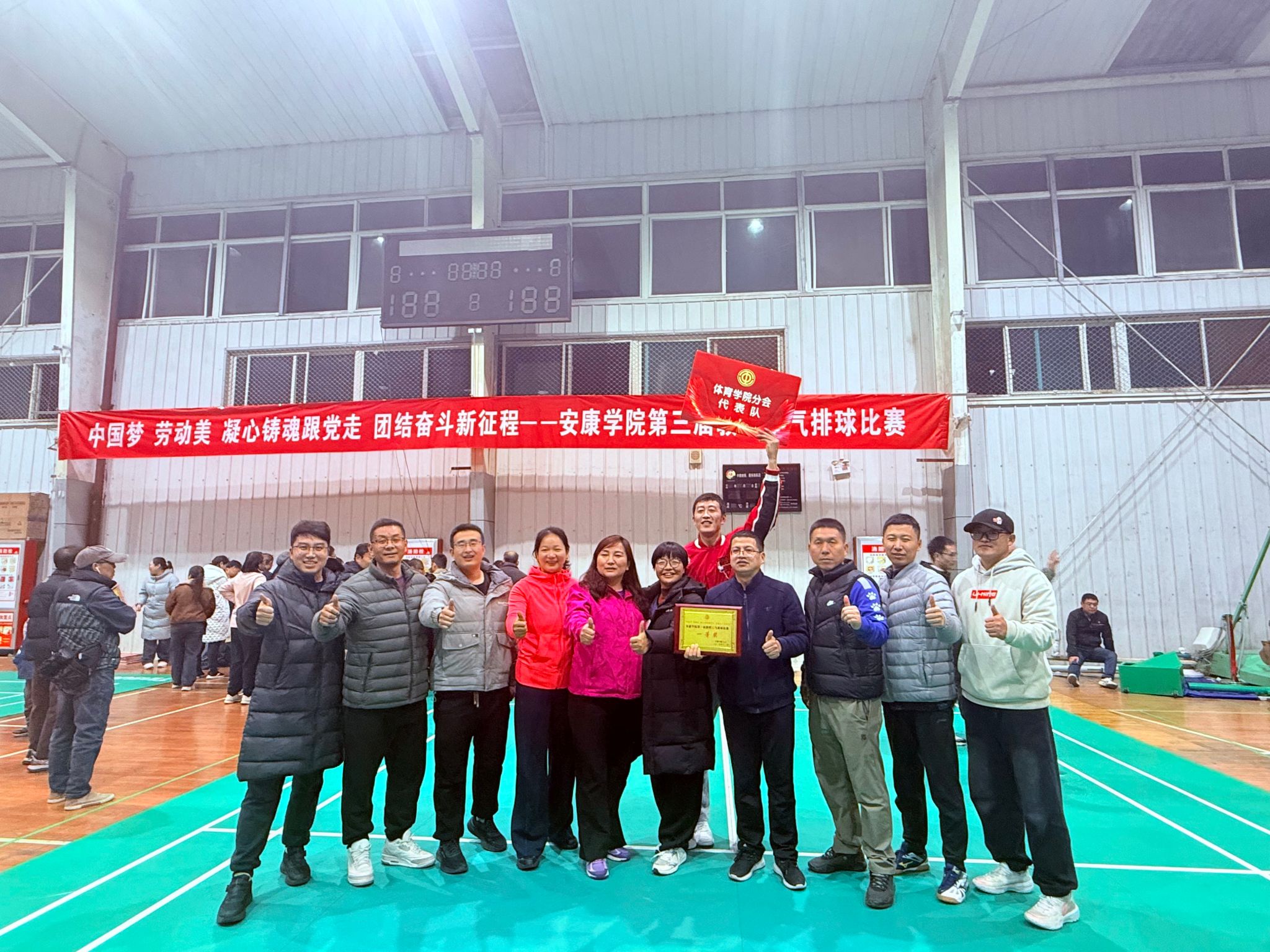 12月2日晚,由校工会主办,best365英国体育在线与工会文体委员会联合承办的“中国梦、劳动美、凝心铸魂跟党走、团结奋斗新征程”best365英国体育在线第三届教职工气排球比赛,在江南校区体育馆圆满结束。经过多轮激烈角逐,best365英国体育在线分会凭借出色的整体发挥和团队协作,最终夺得本届比赛一等奖。