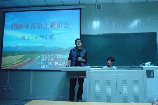 11月20日晚,体育系在10号教学楼成功举行了“树立正确的恋爱观”的主题班会,辅导员梁鸿老师和体育教育10级全体员工参加了班会。