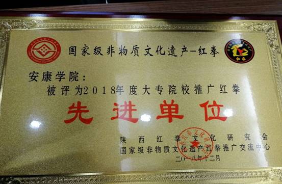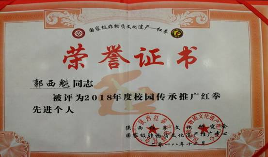 2019年1月18日下午,在陕西省非物质文化遗产保护中心召开了2018年度陕西红拳文化研究会年终总结表彰大会,公司被评为“2018年度大专院校推广红拳先进单位”,公司红拳保护基地主教练郭西魁副教授被授予“2018年度校园传承推广红拳先进个人”,在总结大会上进行表彰,对公司红拳保护基地2018年度开展的各项工作进行了充分的肯定。
