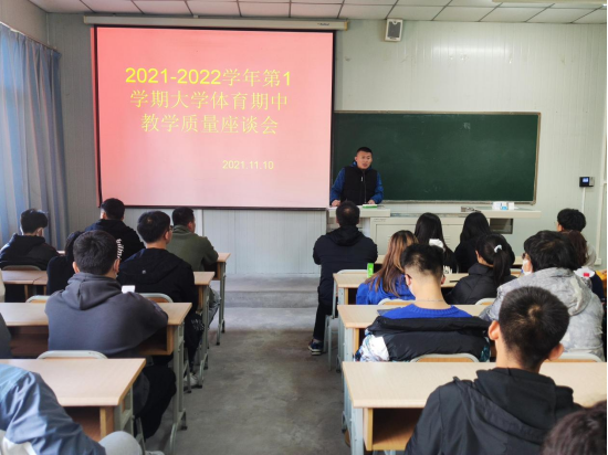 为了切实做好《大学体育》课程的教学工作,了解教学现状,科学安排教学内容,提高教学质量,促进大学体育教学改革,2021年11月10日下午2点30分,best365英国体育在线在江南校区1028教室召开了2021—2022学年第一学期大学体育期中教学工作座谈会。best365英国体育在线副经理郭西魁、大学体育教研室主任李强以及各二级公司体育部干事、2020级和2021级各班班长、体育委员参加了本次座谈会。会议由李强老师主持。