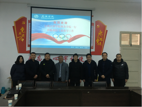 2月9日上午,宝鸡文理公司体育公司党总支书记丁煜成、经理于奎龙、副经理魏俊民一行来公司考察交流工作。体育公司党总支书记高立平、副经理郭西魁、教学督导冯德学、教研室主任李强、刘芹等出席座谈交流会。座谈交流会由郭西魁主持。