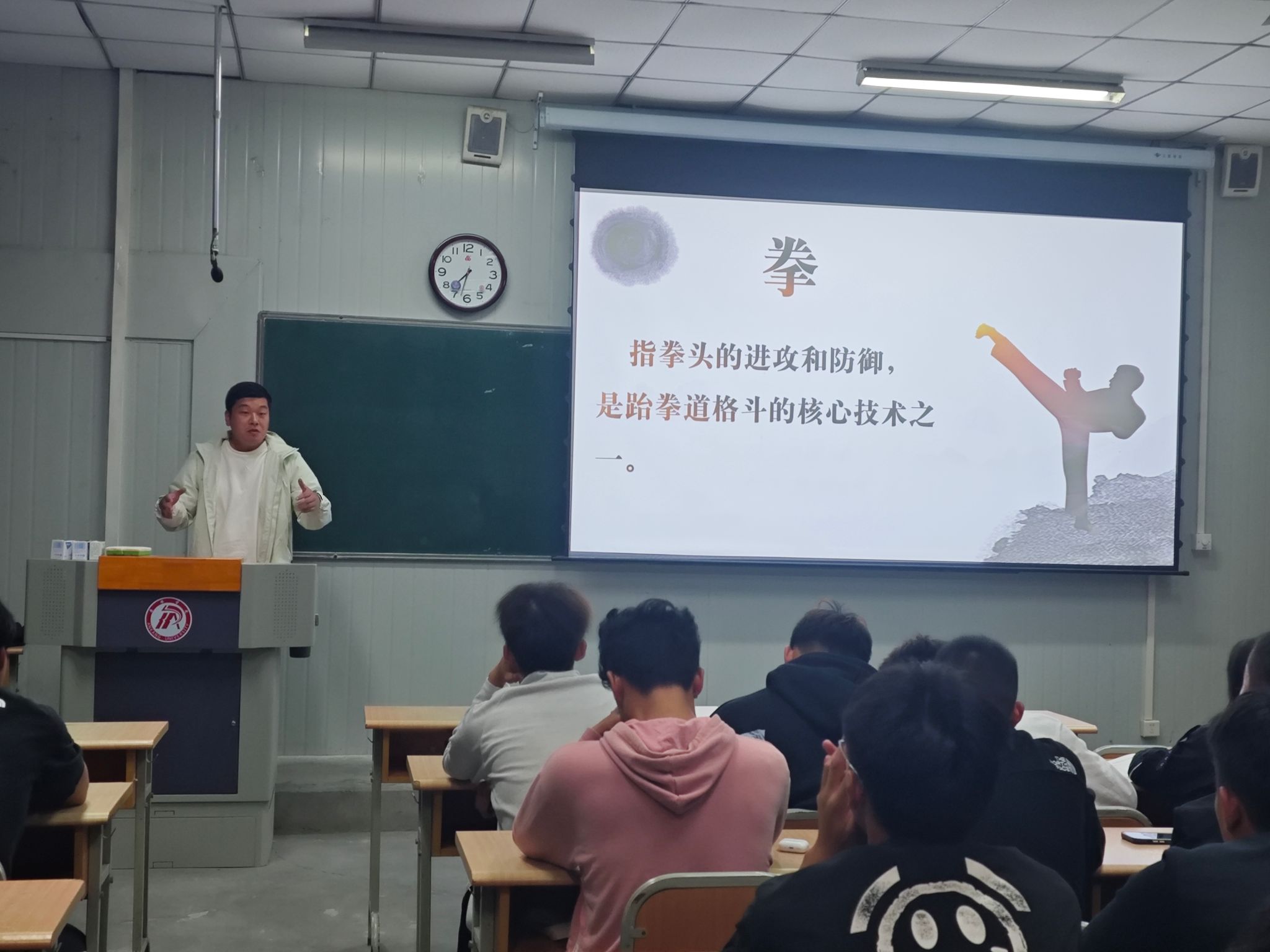 五位教师分别介绍了各自负责的训练队。廖建发展示了健美操和武术的魅力,宁永康介绍了跆拳道的历史渊源和技法,夏琪飞分享了足球的激情与魅力,王俊杰则展示了羽毛球的优雅与速度。各位教师还提出了加入训练队的要求和期望,鼓励新生们积极参与。