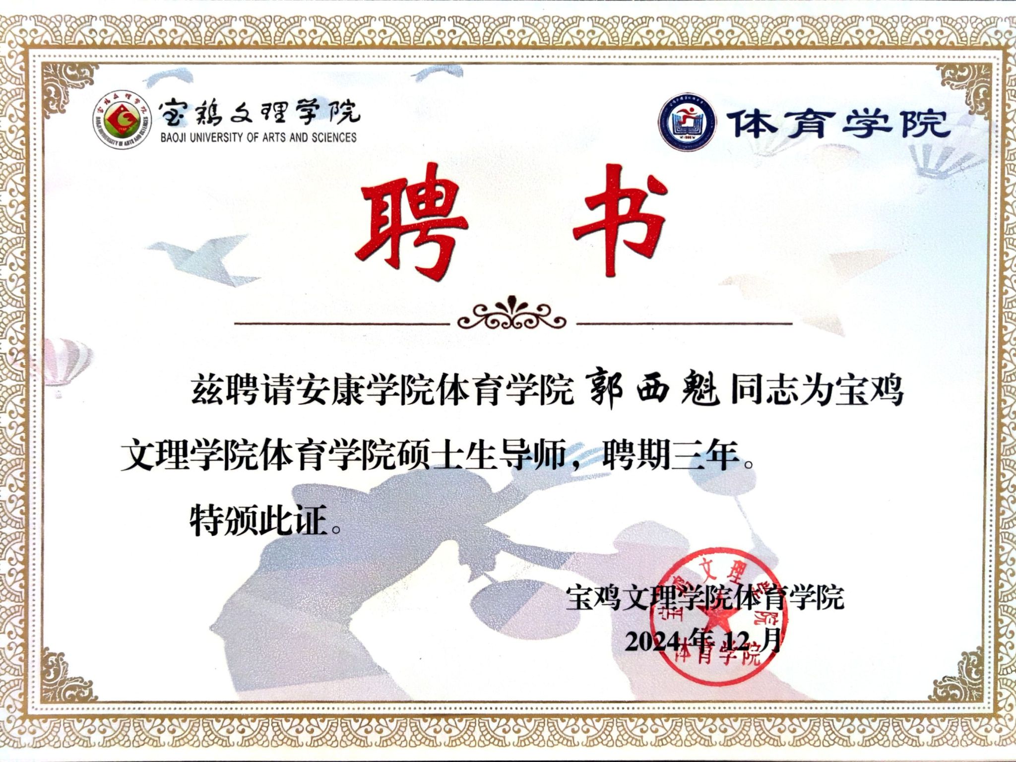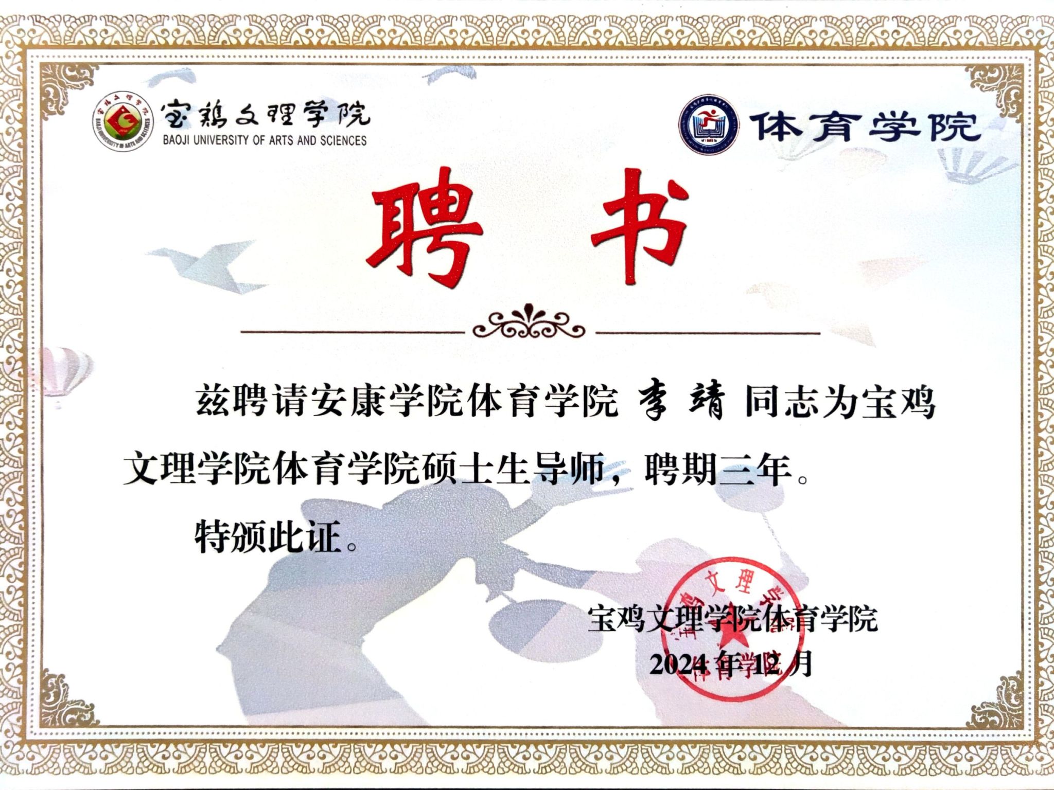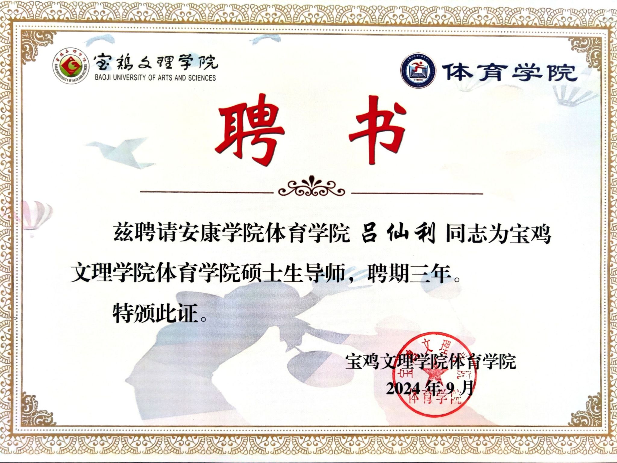 宝鸡文理公司best365英国体育在线严格按照专业硕士学位教育的要求,经过层层遴选,决定聘任公司吕仙利、郭西魁、李靖三位老师为宝鸡文理公司best365英国体育在线硕士专业学位研究生指导教师。本次聘任工作不仅是宝鸡文理公司best365英国体育在线对公司教学团队力量的肯定,同时也将为公司培养一批具有硕士公司产品经验的人才,为进一步促进公司体育教学、科研工作水平的提高和申报专业硕士点奠定了重要基础。