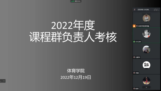 首先,对best365英国体育在线课程群负责人进行了考核,球类课程群负责人崔晓宇、操舞类课程群负责人陈治强、运动人体科学课程群负责人刘芹和公司体育学课程群负责人赵娇艳分别进行了年度总结汇报,考核组通过听取汇报、座谈和查阅工作记录的方式进行考核,并针对本年度工作中存在的不足对三位课程群负责人进行了现场反馈,并提出了下一步工作建议。